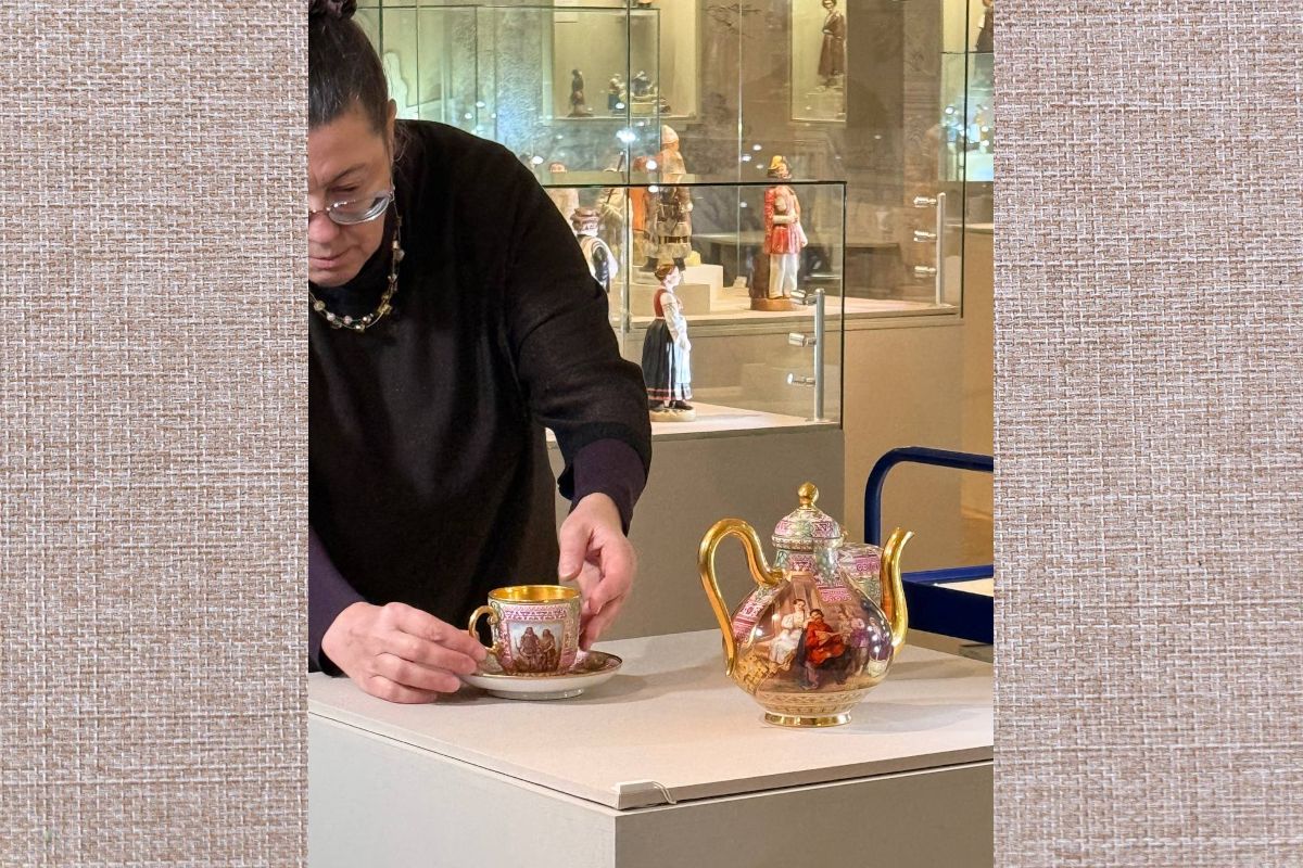 – Это наш первый спецпоказ в рамках выставки «Народы России». Экспонат, на который мы обращаем особое внимание, является единственным представителем фарфора с росписью посудной формы на выставке, – поясняет Елена Петровна Смирнова, заведующая отделом керамики и стекла ГИМ, устанавливая предмет в витрине.