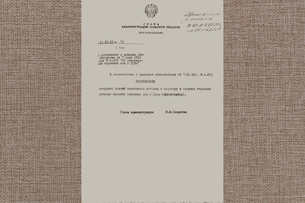 Статус объекта культурного наследия регионального значения у дома появился еще в 1991 году. О чем свидетельствует документ, подписанный тогдашним Главой администрации Тулы Николаем Севрюгиным. В то время дом был еще жилым, а сейчас в нем располагается управление социальной защиты населения по городу Туле.