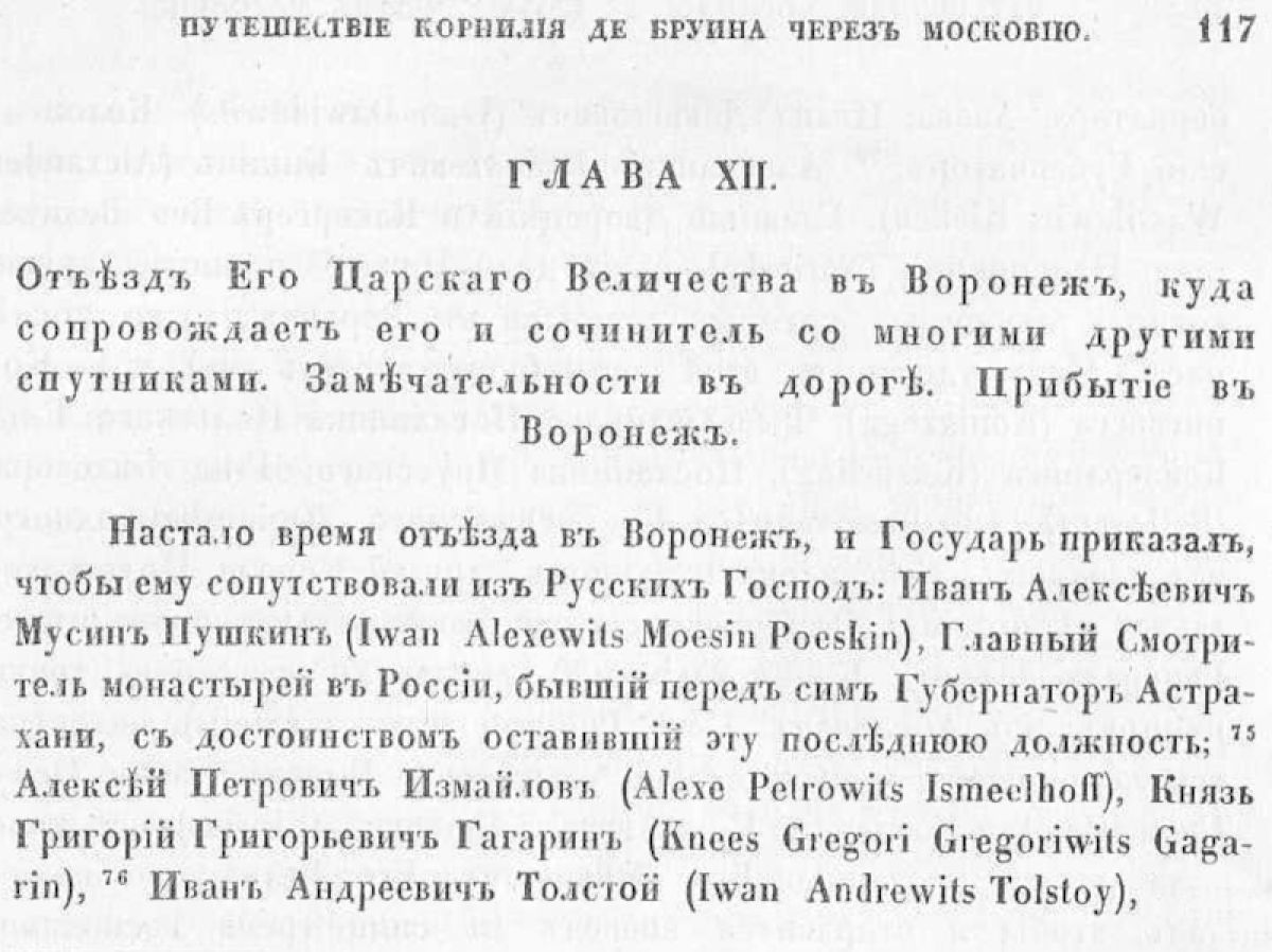 В XII главе автор описывает путь в Воронеж: «Мы отправились из Немецкой слободы в 3 часа пополудни, и должны были менять лошадей каждые 20 верст».