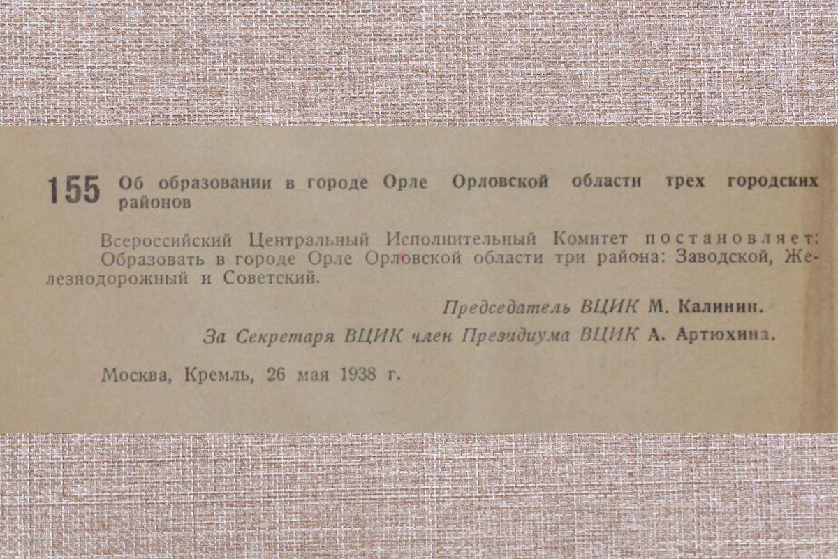 Официально Заводской, Железнодорожный и Советский районы в Орле были образованы постановлением ВЦИК 26 мая 1938 года.
