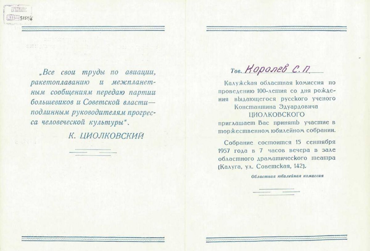Калужское и московское приглашения на торжество / Государственный музей истории космонавтики имени К.Э. Циолковского
