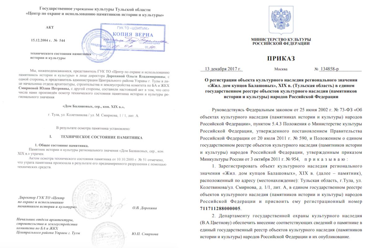 Но случилось невероятное. 13 декабря 2017 года Министерство культуры РФ, в лице заместителя министра О.В. Рыжкова, издало приказ о регистрации... уже не существующего памятника. Дом купцов Балашовых был официально внесен в единый государственный реестр объектов культурного наследия с присвоением регистрационного номера 711711288000005.