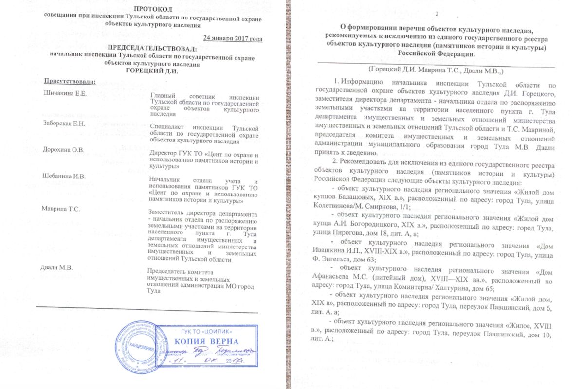 Вывод был стандартным для подобных ситуаций: «Утраченный объект являлся средовым в застройке Тулы и не обладал выдающейся исторической ценностью». Одновременно эксперты подтверждили полную физическую утрату подлинных конструкций фундаментов, наружных и внутренних стен, кровли, элементов декора, то есть в целом объекта культурного наследия.