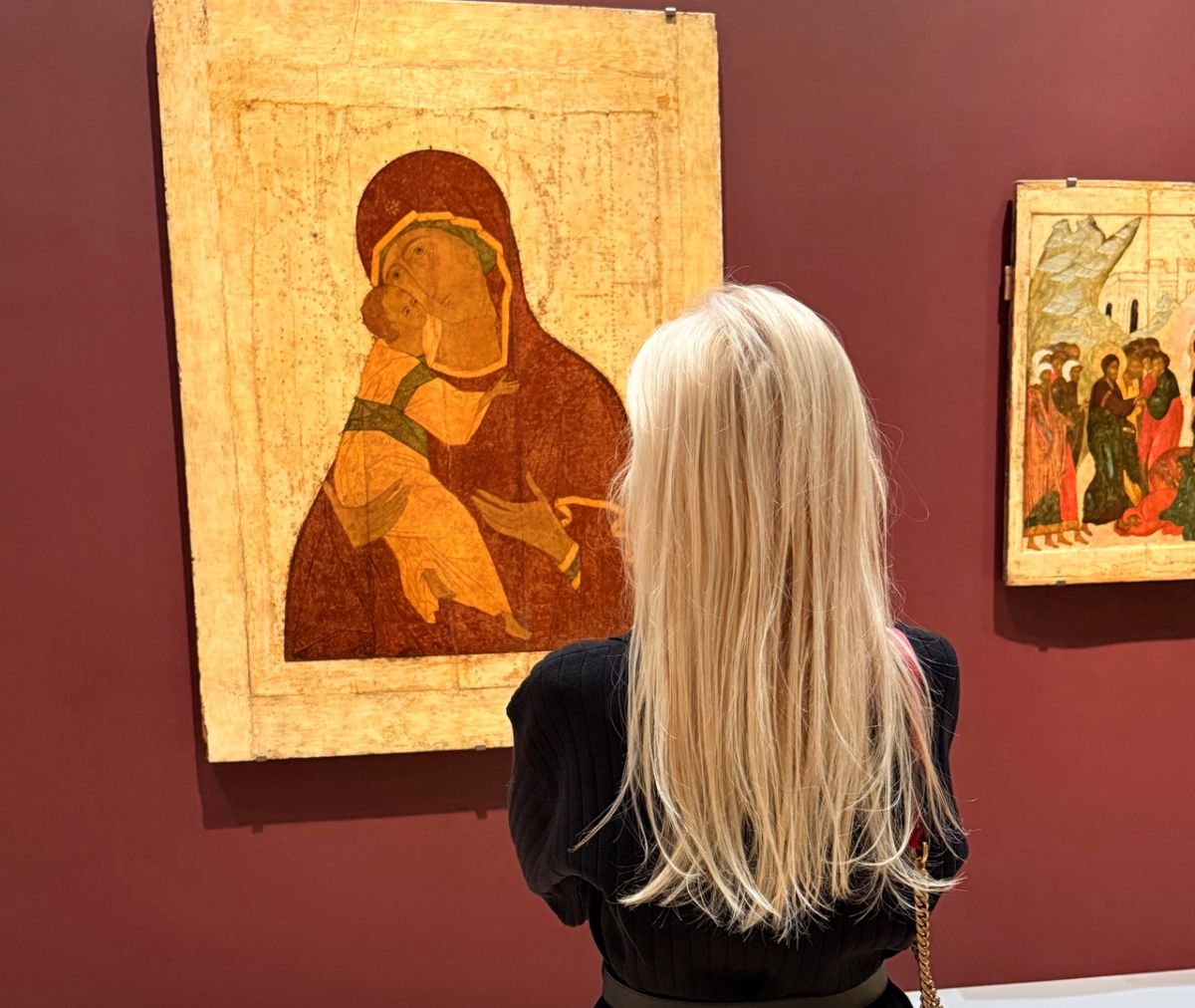 Начнём с древности. Один из главных экспонатов выставки — «Владимирская Богоматерь» XVII века. Это список с одной из самых почитаемых русских святынь, икона, перед которой веками молились, просили заступничества и защиты. Её образ — это сама история России, её вера и душа.