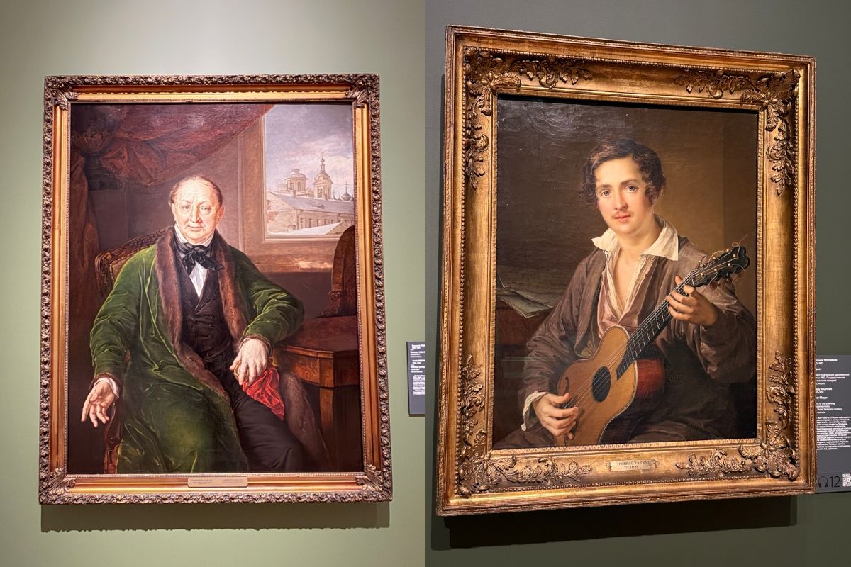 Продолжим прогулку по залам. Василий Тропинин — бывший крепостной, ставший академиком живописи. Здесь представлены его камерные и вдумчивые портреты: помещика Протасьева и его супруги, а также знаменитый «Гитарист» — образ, полный задушевности и тепла.