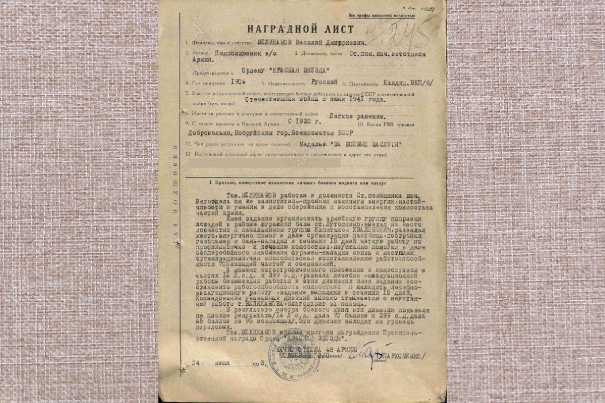 Василий Дмитриевич прошел Великую Отечественную от первого до последнего дня. Был ранен, пережил тяжелую контузию. Награжден множеством орденов и медалей, в том числе и за работу с животными. «Проявил максимум энергии, настойчивости и умения в деле сбережения и восстановления консостава частей армии», - говорится в наградном документе.